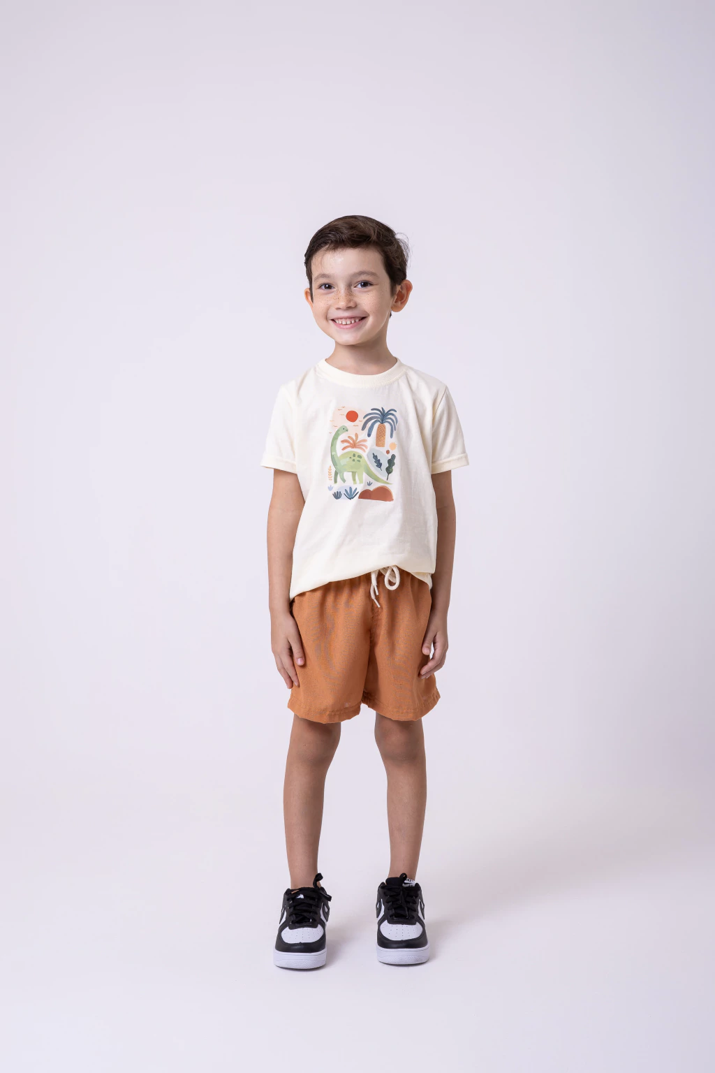 O Conjunto Dino é perfeito para acompanhar os pequenos em momentos de diversão com muito conforto e estilo. A camiseta em tom claro traz uma estampa delicada e divertida de dinossauro em meio à natureza, despertando a imaginação e deixando o visual leve e encantador.