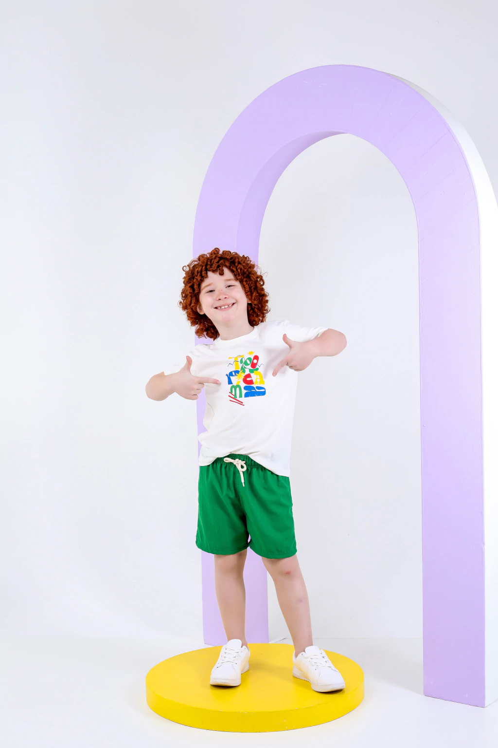 O short em tom verde vivo complementa perfeitamente a proposta, trazendo frescor, conforto e liberdade para acompanhar os pequenos em todas as brincadeiras, passeios e descobertas do dia a dia.