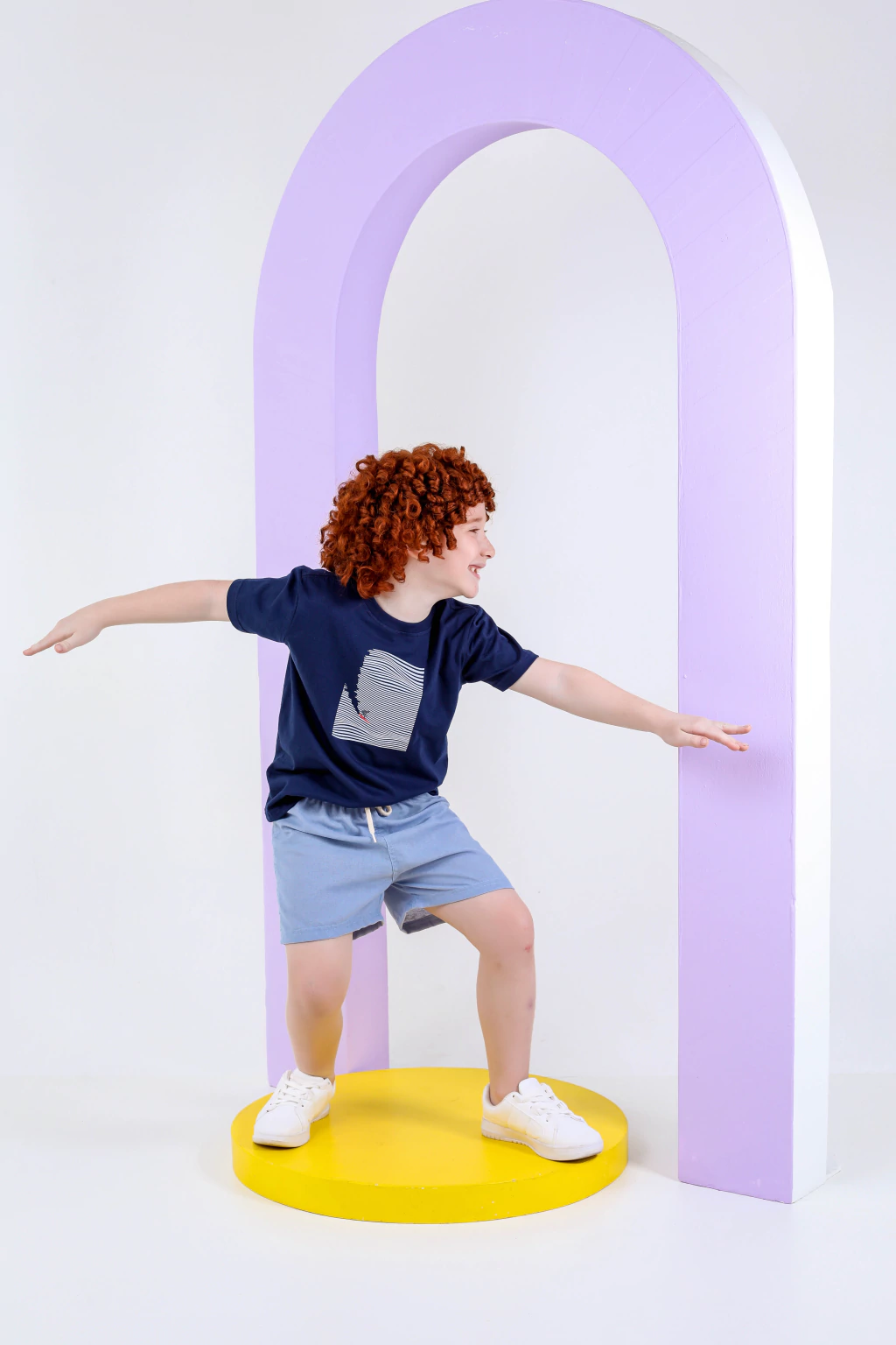 O short em tom azul claro complementa o conjunto com harmonia e frescor, garantindo conforto e praticidade para acompanhar as crianças em todos os momentos — das brincadeiras ao passeio em família.